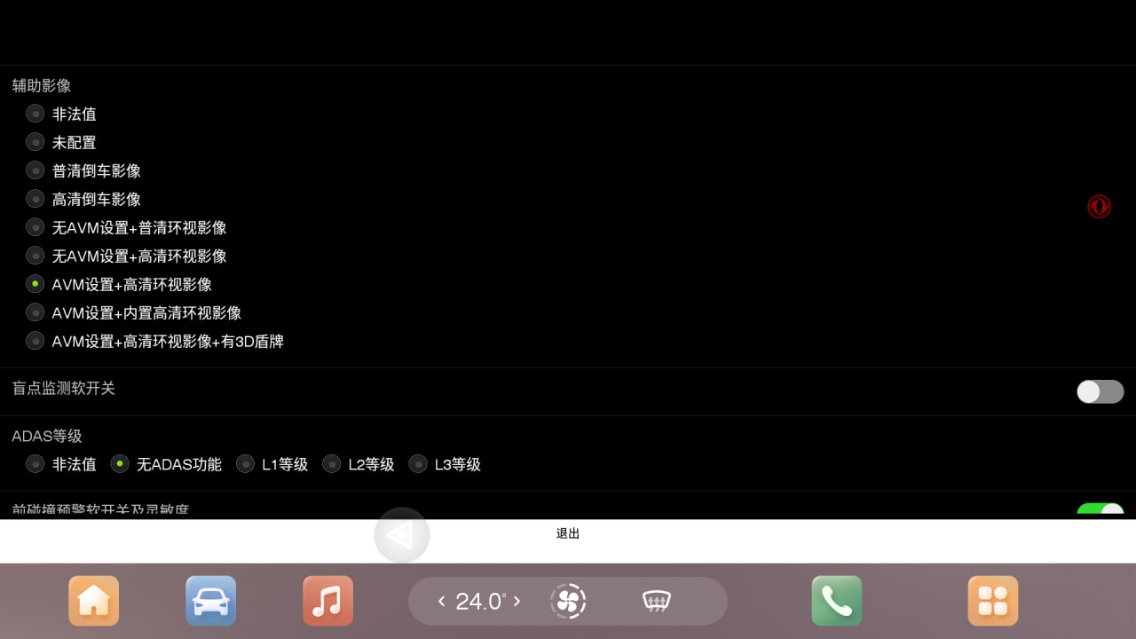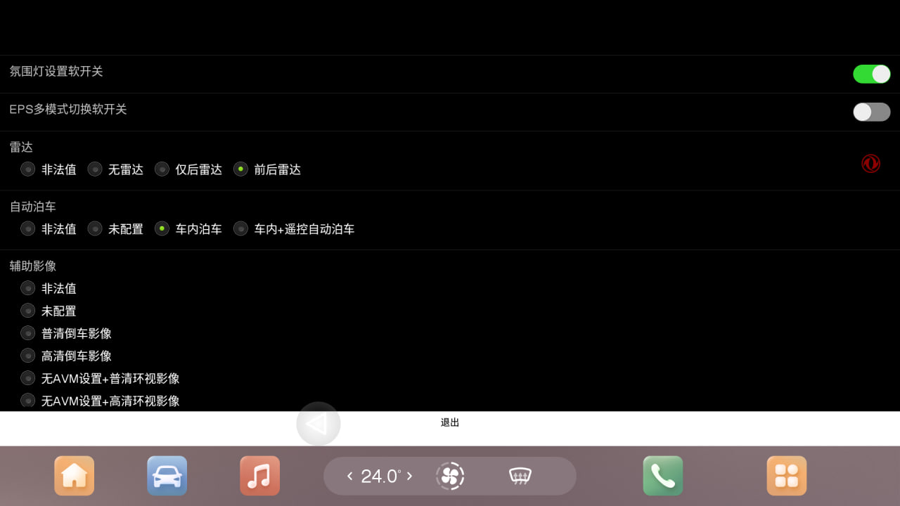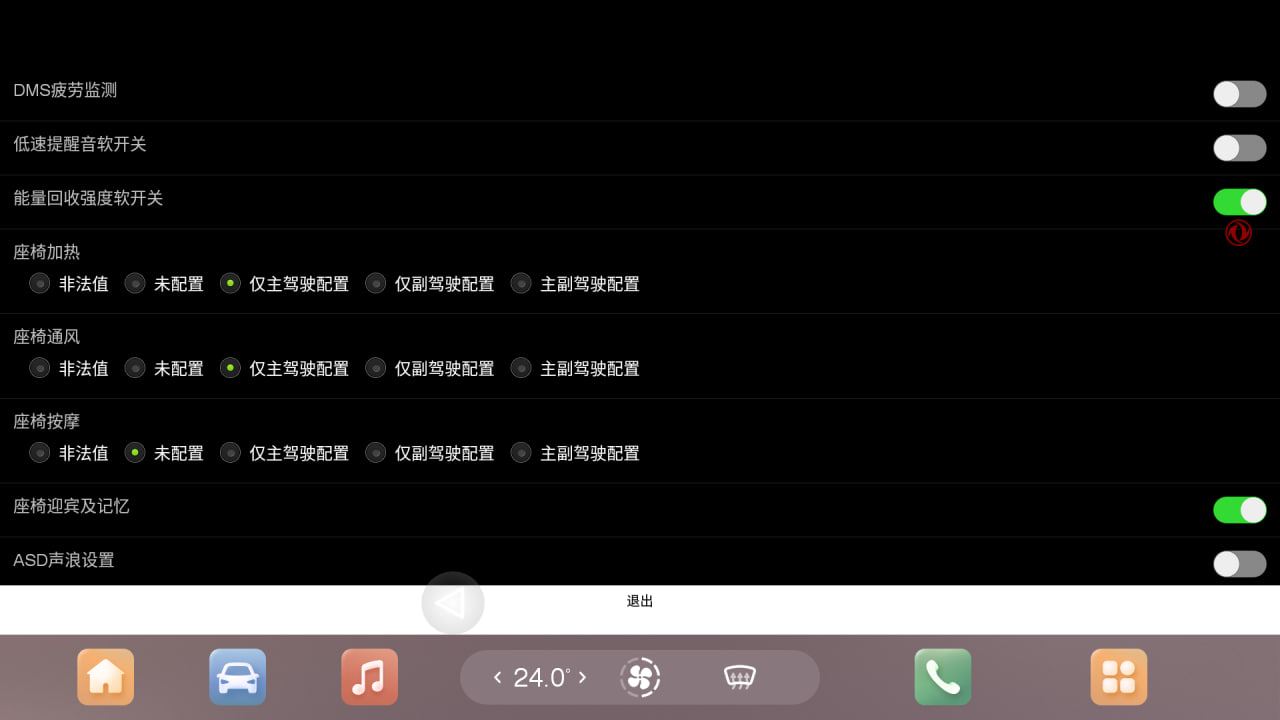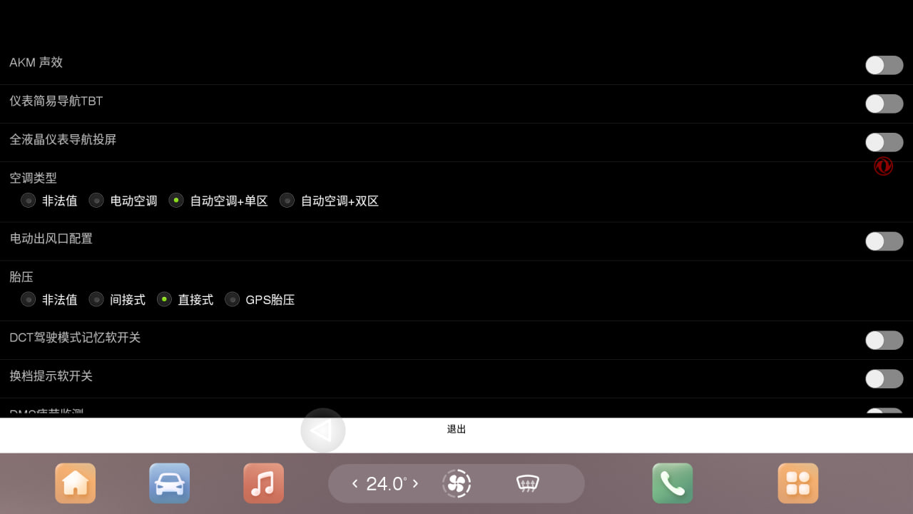 После включения или выключения опции (либо ряда опций) необходимо нажать на иероглиф подтверждения в сером поле внизу экрана инженерного меню, после чего перезагрузить ГУ долгим удержанием кнопки Mode на руле.