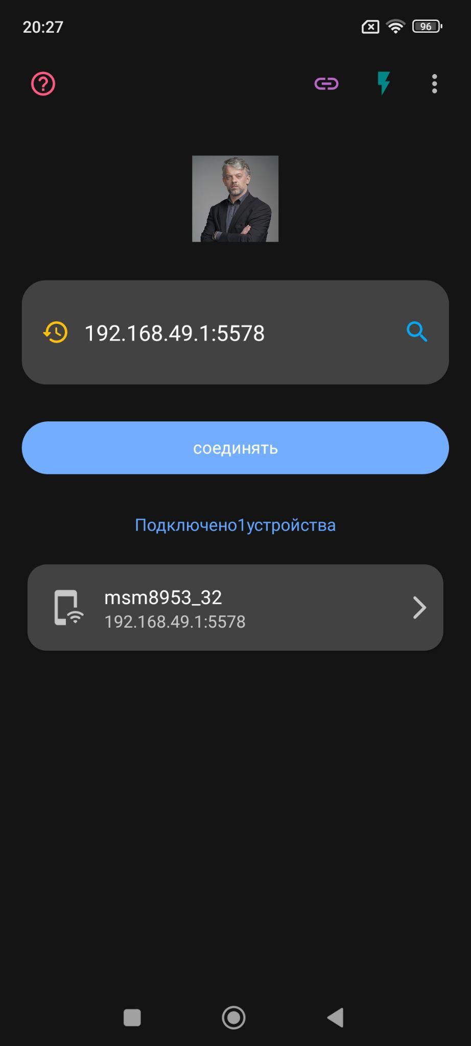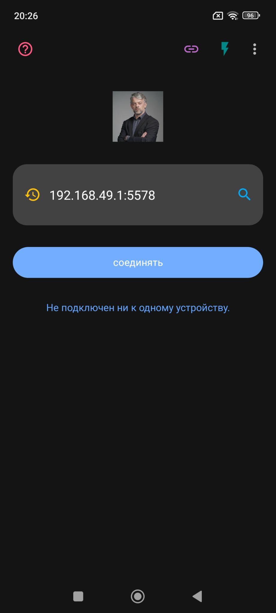 2. В цифровое поле введите адрес 192.168.49.1:5578 и нажмите синюю кнопку “Соединять”