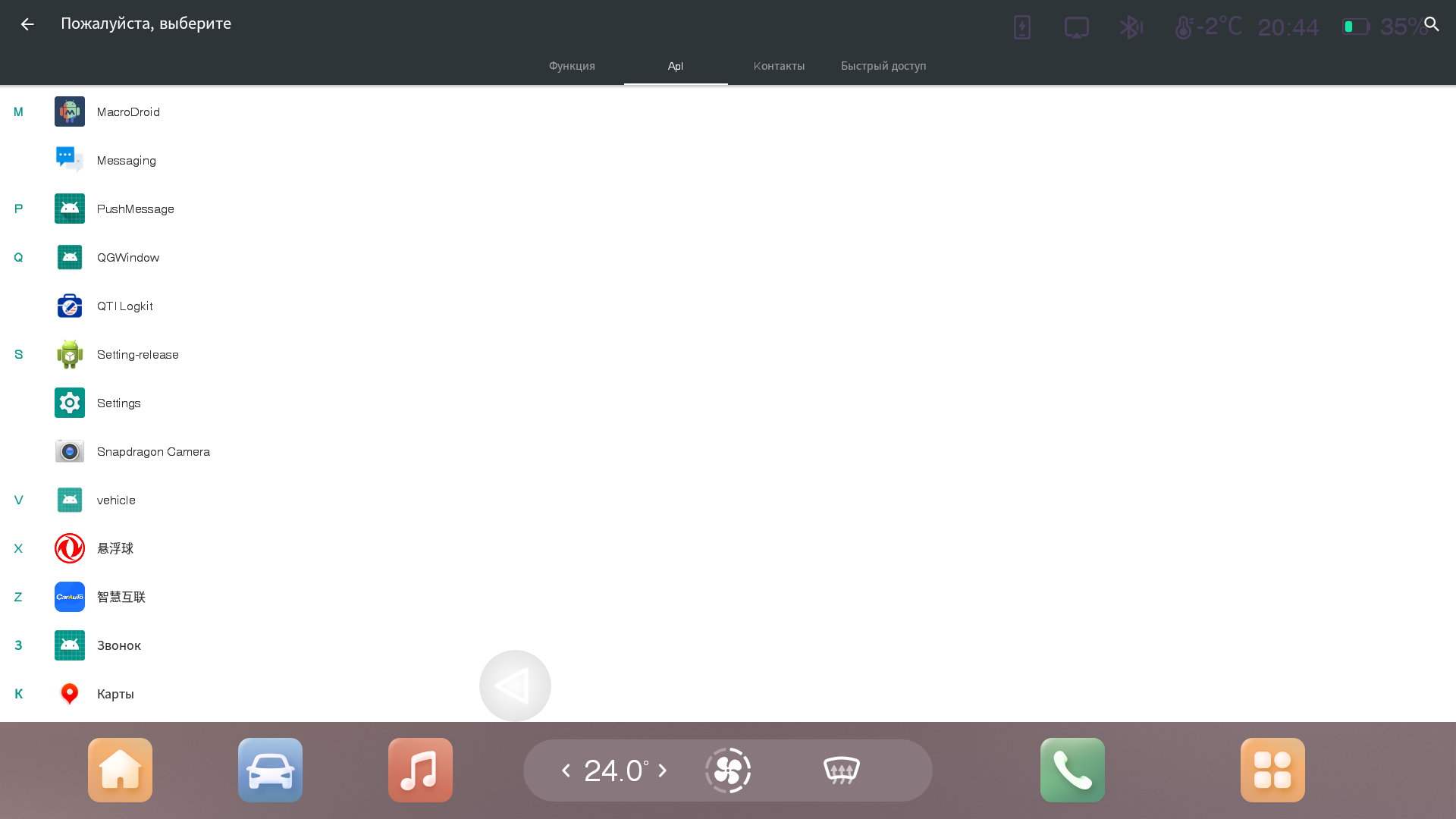 • Функция “Приложения”, которая вызывает список установленных в ГУ приложений с возможностью их запуска (иконка с плитками квадратом 3х3)