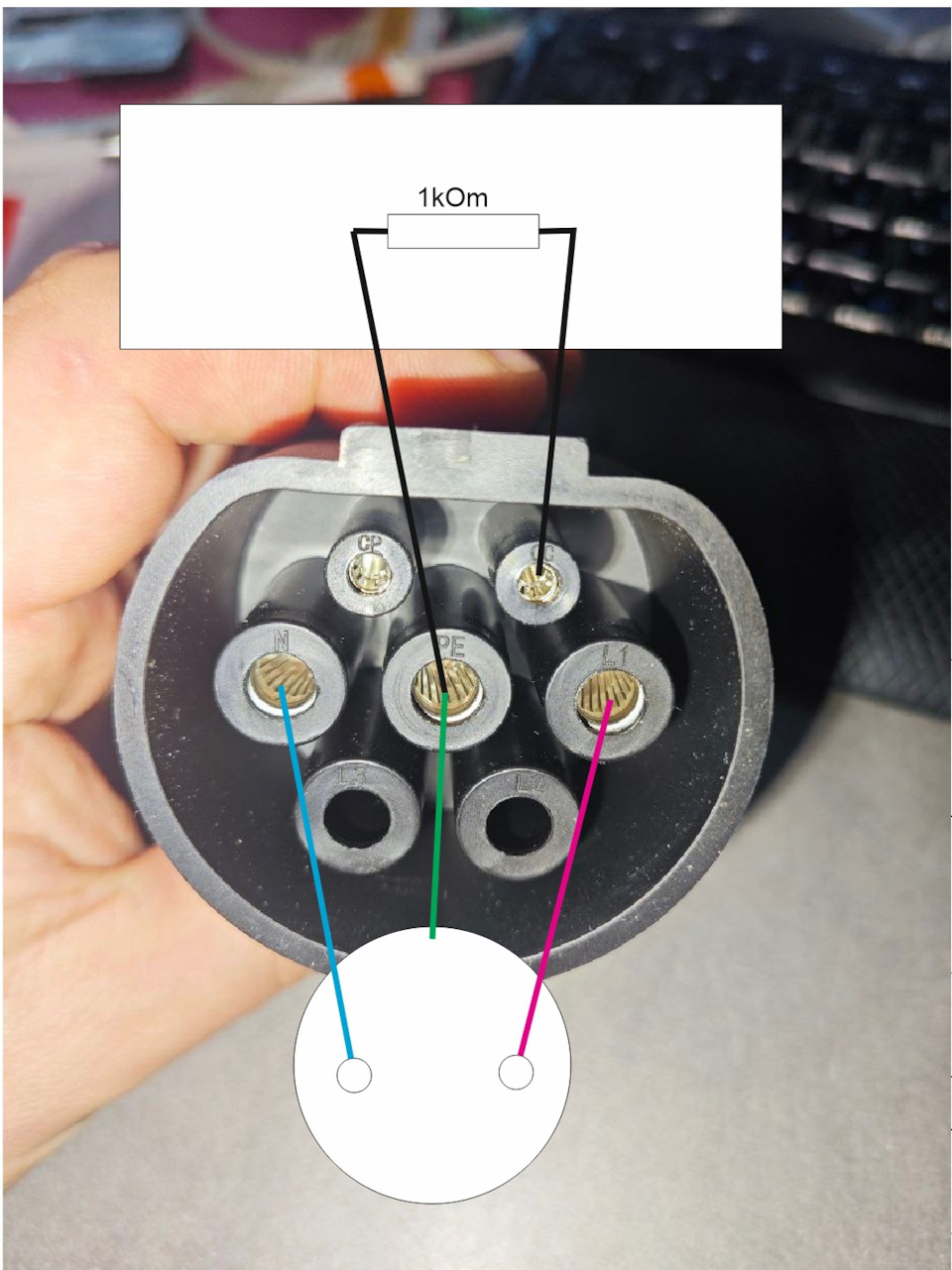 Схема разъёма довольно простая. Смысл в том, что по наличию обычного сопротивления на 1кОм между контактами земли PE(Protective Earth) и СС (Charging Confirmation) автомобиль определяет, что в него вставлен разрядник и подаёт на фазу и нейтраль заветные 220В. Причем снять можно 3кВт. Это очень много. Чайник, к примеру, потребляет около 800 Вт.